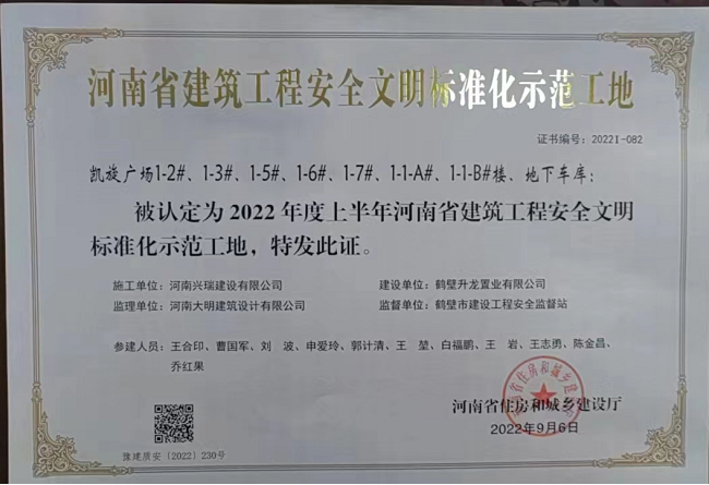 10月11日,公司承建的鶴壁凱旋廣場項目榮獲“2022年上半年河南省建筑工程安全文明標(biāo)準(zhǔn)化示范工地 ”稱號。自開工以來,項目部制訂了河南省安全文明工地創(chuàng)建計劃,成立了以項目經(jīng)理為組長的領(lǐng)導(dǎo)小組,將安全生產(chǎn)責(zé)任層層分解,保障安全文明資金專款專用,積極開展隱患排查治理、教育培訓(xùn)等工作,確保各項安全、環(huán)保工作落實到位。一直以來,公司高度重視安全文明工地的創(chuàng)建工作,項目開工前,明確約定創(chuàng)優(yōu)目標(biāo),對獲獎項目按規(guī)定予以表彰獎勵。同時,安排專人對項目創(chuàng)優(yōu)工作進行跟蹤指導(dǎo),針對專家組提出的問題,督導(dǎo)項目部按期整改落實,確保通過率達到100%。經(jīng)過不懈努力,公司形成了比學(xué)趕超、爭優(yōu)創(chuàng)先的良好氛圍,工程項目建設(shè)創(chuàng)優(yōu)創(chuàng)杯能力大幅提升,樹好了“河南興瑞”品牌。 據(jù)悉,公司承建的鶴壁凱旋廣場是淇河邊新地標(biāo)建筑,建業(yè)集團在河南的第六座凱旋廣場。坐擁淇河生態(tài)風(fēng)貌帶,臨河地塊,整體規(guī)劃47萬平方米,項目有有13棟樓,9棟住宅,2棟辦公樓,2棟公寓,集萃商業(yè)住宅公寓寫字樓等全業(yè)態(tài),約141米灣畔天幕雙子塔,名師打造,將為鶴壁在淇河打造天際線。其中目前正在施工的一期住宅樓1-2#、1-3#、1-5#、1-6#、1-7#五棟樓總建筑面積90951平方米,剪力墻結(jié)構(gòu),筏板基礎(chǔ),地上27層地下三層,建筑高度79.85米。一期1-1-A#寫字樓總建筑面積66390平方米,地上26層,地下2層,建筑高度141米;1-1-B#公寓樓總建筑面積129864平方米,地上17層,地下2層,建筑高度99.65米,目前寫字樓和公寓正在緊張的主體結(jié)構(gòu)施工中。