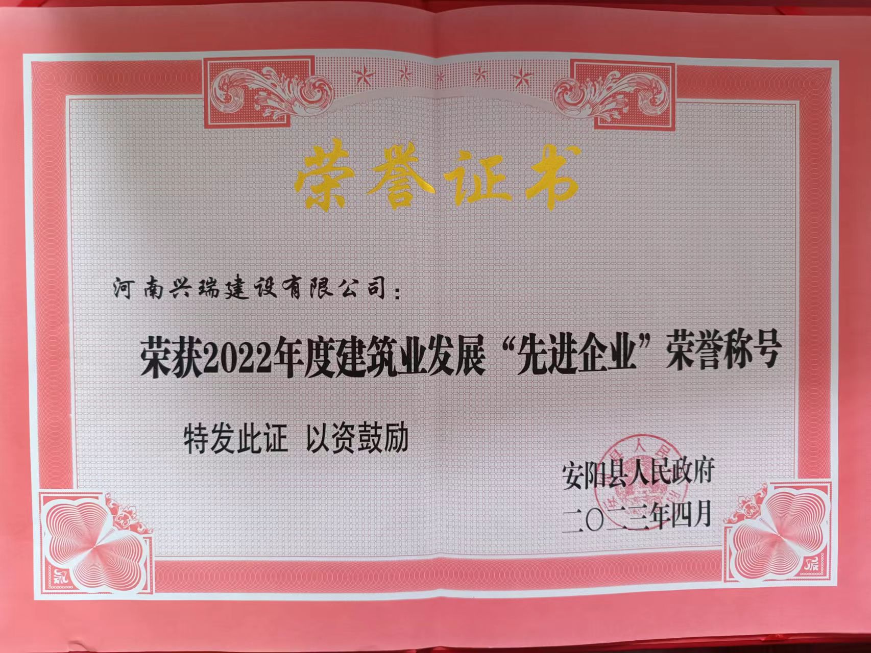 2023年4月12日,在安陽縣政府組織召開的2022年度建筑業(yè)發(fā)展大會上,安陽縣人民政府對2022年度建筑業(yè)發(fā)展做出突出貢獻(xiàn)的企業(yè)和優(yōu) 秀項目經(jīng)理進(jìn)行了通報表彰,河南興瑞公司榮獲安陽縣”2022年建筑業(yè)先進(jìn)企業(yè)“,李振榮獲安陽縣”優(yōu) 秀項目經(jīng)理。
